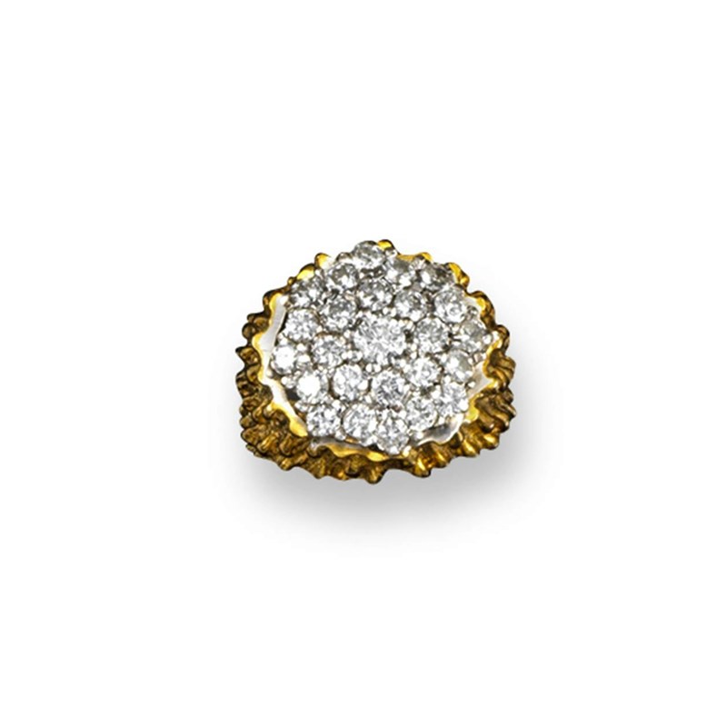 A diamond set cluster ring, set with graduated round brilliant-cut diamonds to the heavily textured gold ring, size F.