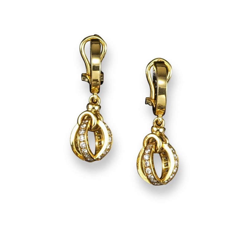 A pair of diamond set gold drop earrings, signed Garrard.