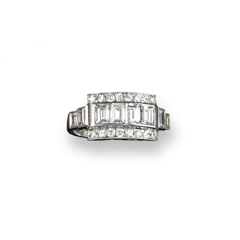 A diamond half hoop ring, set with a line of graduated baguette-shaped diamonds within circular-cut diamonds in platinum. Size N.