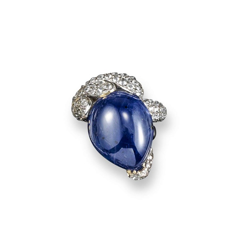 A sapphire and diamond-set ring, the pear-shaped cabochon sapphire weighs approximately 29.00cts, set in gold and platinum and pave-set with rose-cut diamonds and small circular-cut sapphires. Engraved to the inside shank S 29.57 D 2.46. Size O.