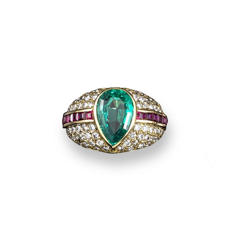 An emerald, diamond and ruby ring, the pear-shaped emerald is set with a line of square-shaped rubies and pave-set with round brilliant-cut diamonds in gold. Size M 1/2.