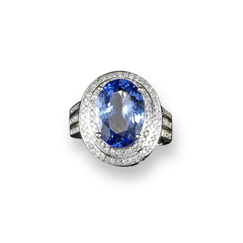 A tanzanite and diamond cluster ring, the oval-shaped tanzanite is set within surrounds of single-cut diamonds in white gold. Size M 1/2.