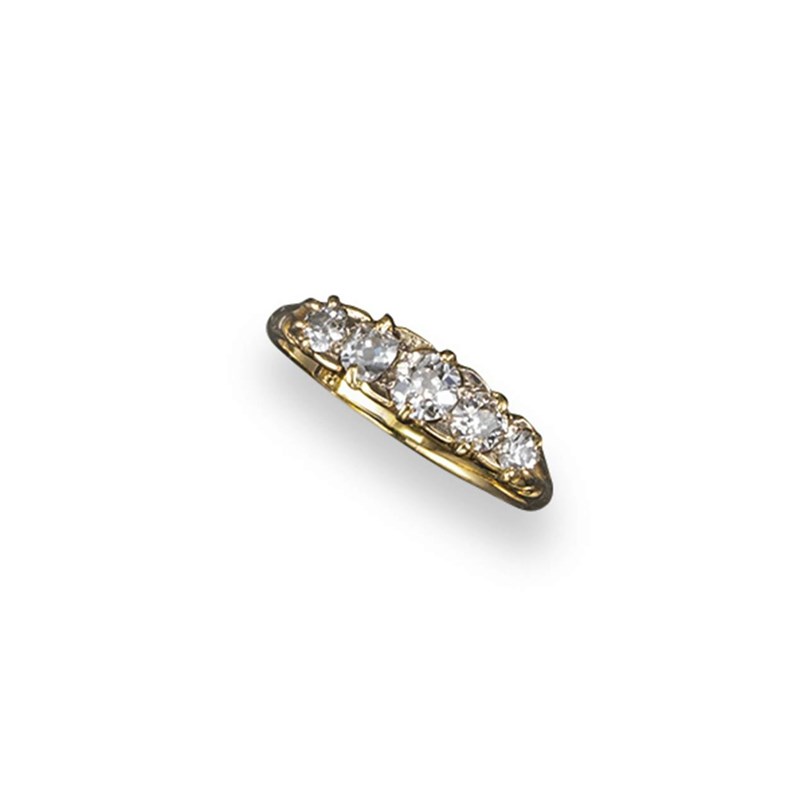 A diamond five stone ring, set with five graduated circular-cut diamonds in gold with scroll carved shoulders in gold. Size O.