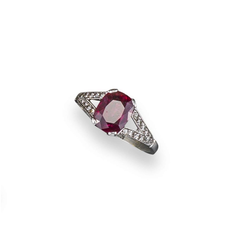 A ruby and diamond ring, the oval-shaped ruby is set in white gold and platinum with small circular-cut diamonds set to the V-form shoulders, size M 1/2.