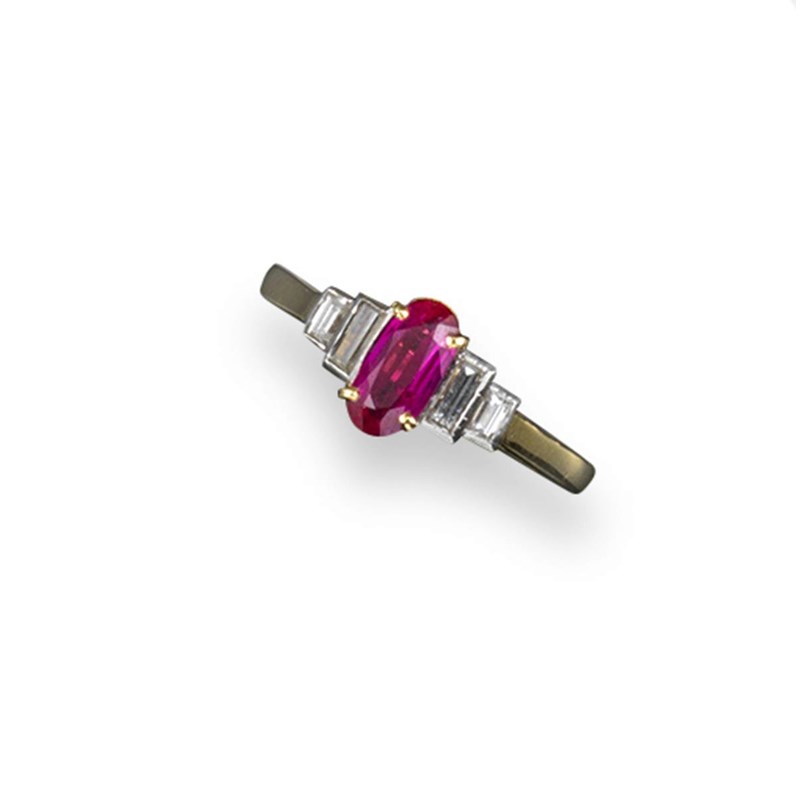 Accompanied by report number 5775-1523 dated 5th March 2015 from GCS, London stating that the oval-shaped ruby weighs approximately 0.90 carats and is a natural ruby with no evidence of heating. Origin: Burma.