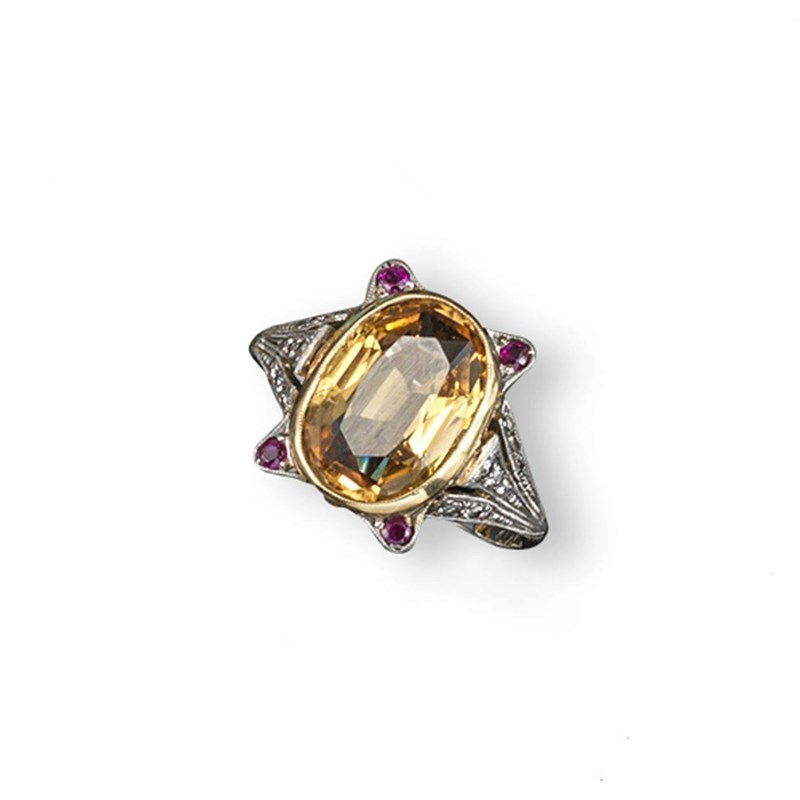 An early 20th century topaz, ruby and diamond ring by Mrs Newman. The oval-shaped topaz is set with four small circular-cut rubies and with graduated circular-cut diamonds set to the shoulders. White gold and platinum. Signed. Size R 1/2.