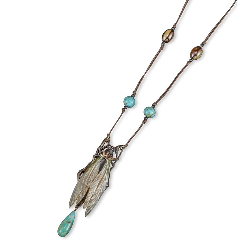 An Art Nouveau Bonté carved horn insect pendant, with coloured highlights and suspending a blue stone cabochon pendant, on a brown fabric necklace with similar blue beads and two simulated agate beads. The pendant 10.5cm long.