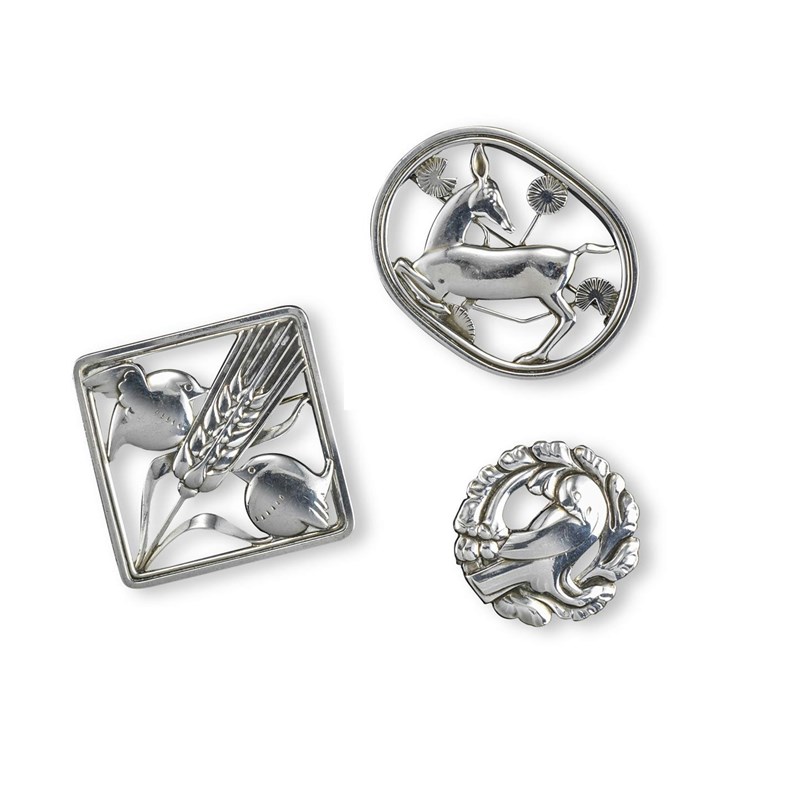 A silver Kneeling Deer brooch by Georg Jensen, design no. 256, signed and London import mark 1974. 4.5cm wide. A silver circular bird brooch by Georg Jensen, design no. 134, signed and London import marks for 1975. 3cm wide. And a silver square form bird's on a wheatsheaf brooch by Georg Jensen, design no. 250, signed with London import marks for 1947. 5cm wide.