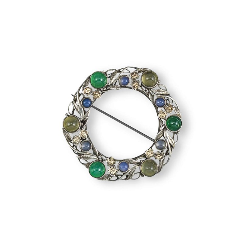A Arts and Crafts circular brooch, mounted with dyed chalcedony cabochons and with pierced foliate decoration, in the manner of Henry Murphy. 3.5cm wide.