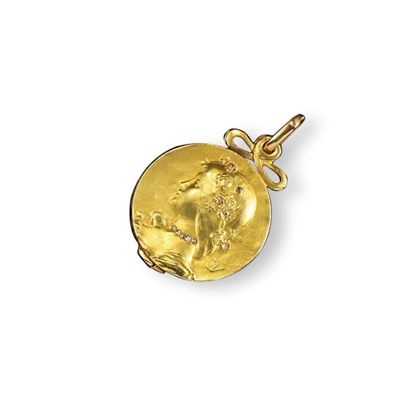 A French gold circular Art Nouveau locket pendant, depicting the profile of a girl wearing rose-cut diamonds to her hair and necklace. Chased with foliate pattern to reverse. Sliding locket compartment. Marks. Probably Comte de'Epinay de Briort. C1900. 2cm wide.