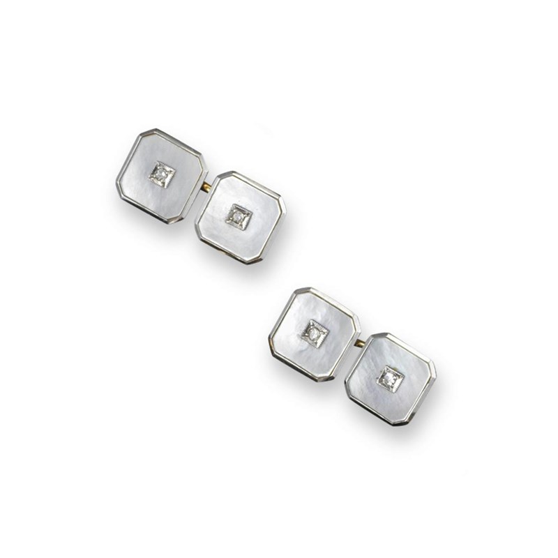 A cased set of dress cufflinks and studs, of square octagonal form and centred with a small diamond on shell ground, in gold and platinum, comprising a pair of cufflinks, four larger dress studs and two smaller.
