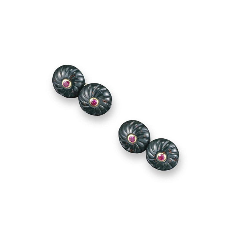 A pair of bloodstone cufflinks, the carved circular bloodstone discs set with a central circular cut ruby in yellow gold. Marked Trianon and 750. Each disc 1.2cm diameter.