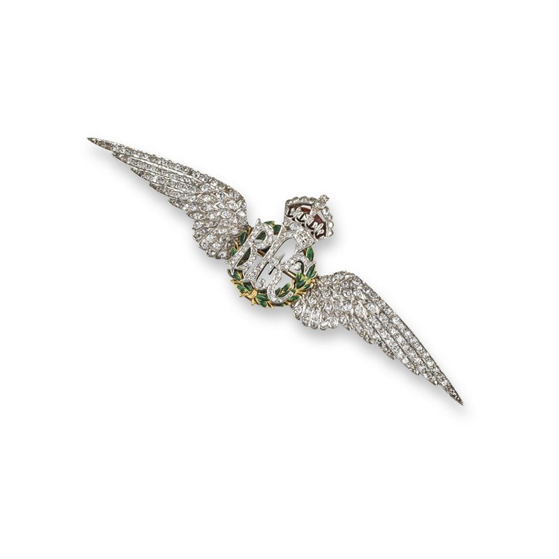 A Regimental brooch for the Royal Flying Corps, the impressive brooch set overall with circular-cut diamonds in platinum and gold with enamel decoration. 9.5cm wide. Case.