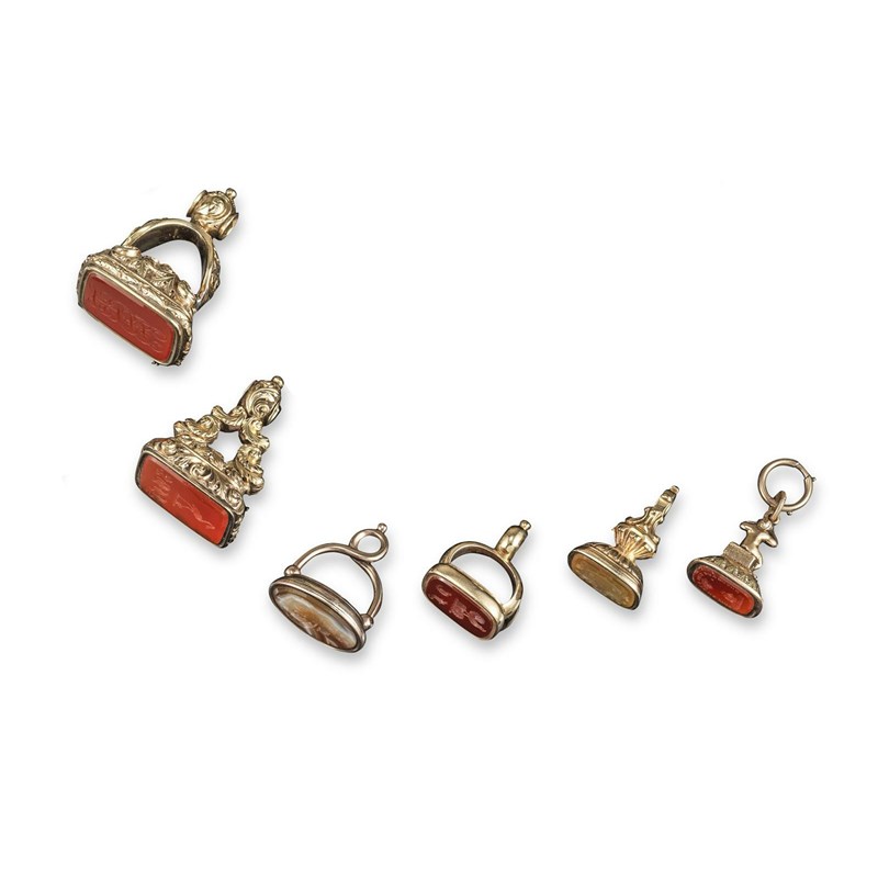 Seven assorted fob seals, including an early 19th century gold seal mounted with a puti seated on a casket, the carnelian matrix engraved with a sailing ship and the motto Dovunque Giroatemefido, 2 cm high. A George III stirrup form fob seal, the banded agate matrix engraved with a cockerel and wheatsheaf crest over initials and motto, 2.5cm high. A George III gold rectangular fob seal with snake body and the rectangular chalcedony matrix engraved Louisa. 2cm high. And three other fob seals.
