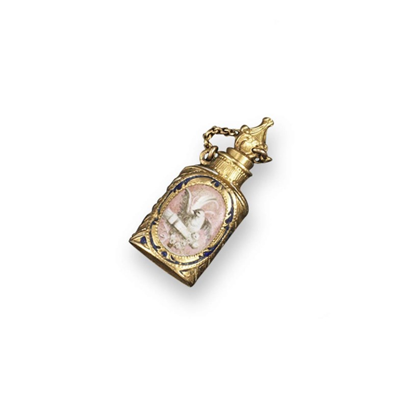 A small gold 19th Century scent flask, painted with enamel doves to both sides and further blue enamel decoration, the stopper connected with fine link chain. 2.5cm high.