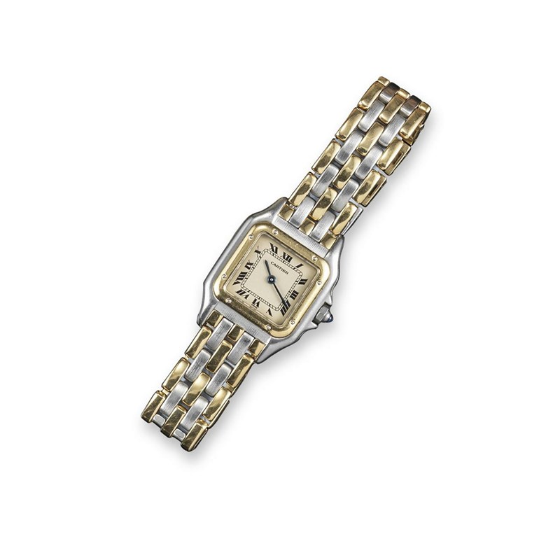 A lady's steel and gold Panthere wristwatch by Cartier, signed square dial with secret signature at seven. With black Roman numerals, steel and gold band with Cartier deployant clasp. Quartz movement.