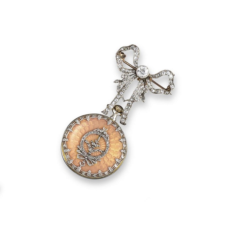 A gold and platinum diamond set Belle Epoque enamel fob watch, the circular dial with Arabic numerals and decorated to the reverse with small diamonds on pink guilloche enamel ground. Suspending from a gold and platinum bow with small flowers and set overall with graduated circular and cushion-shaped diamonds.