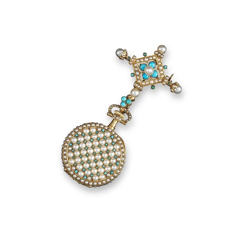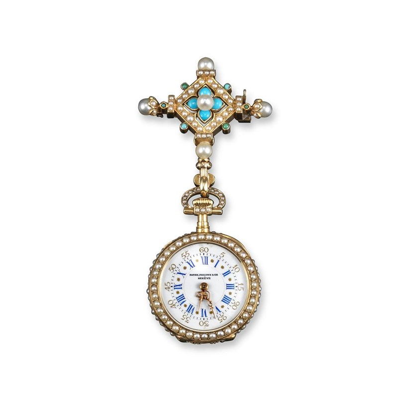 A gold gem-set fob watch by Patek Philippe, the signed white enamel dial with blue Roman numerals and gold Arabic minute numerals. Gold scroll hands. Signed lever escapement and numbered 104532. Signed inner cover with repeated serial number. The cover with Patek Philippe maker's mark and numbered 215959 to the interior. Pave-set with seed pearls and turquoise cabochons to the reverse. Suspended from a gold quarterfoil brooch set with seed pearls and turquoise cabochons. Total height 6.5cm. Fitted case by Carrington.