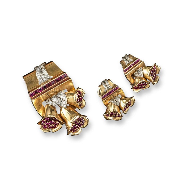 A 1940s gem-set floral brooch with matching earrings, set overall with rubies and diamonds in gold. 55g in total. With Boucheron case.