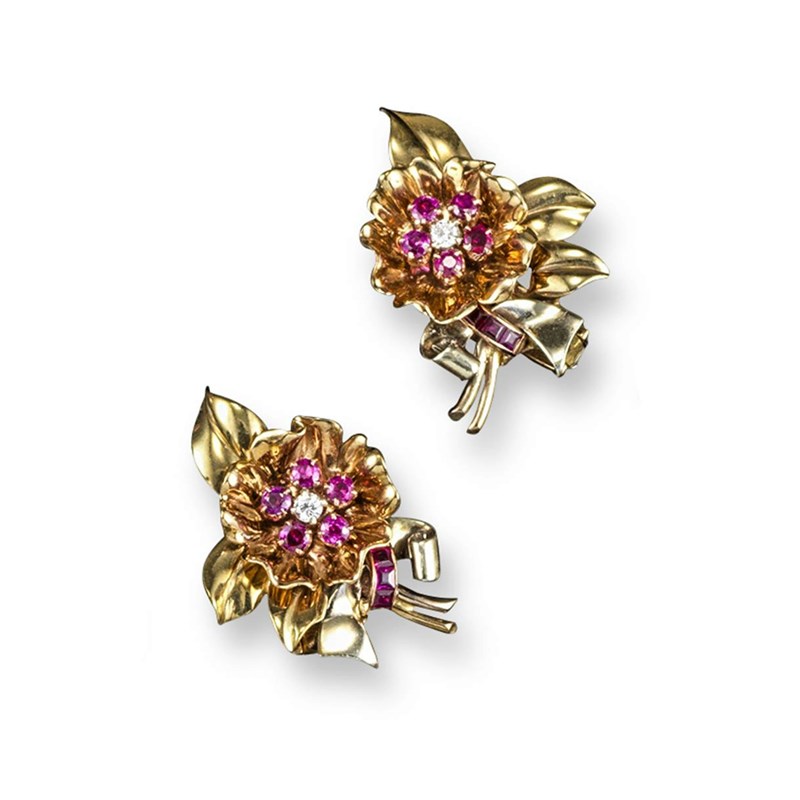 A pair of ruby and diamond set gold floral earrings, the stylised flowers set with circular and calibre-cut rubies and a central diamond in yellow gold. Clip fittings. 3cm longest.