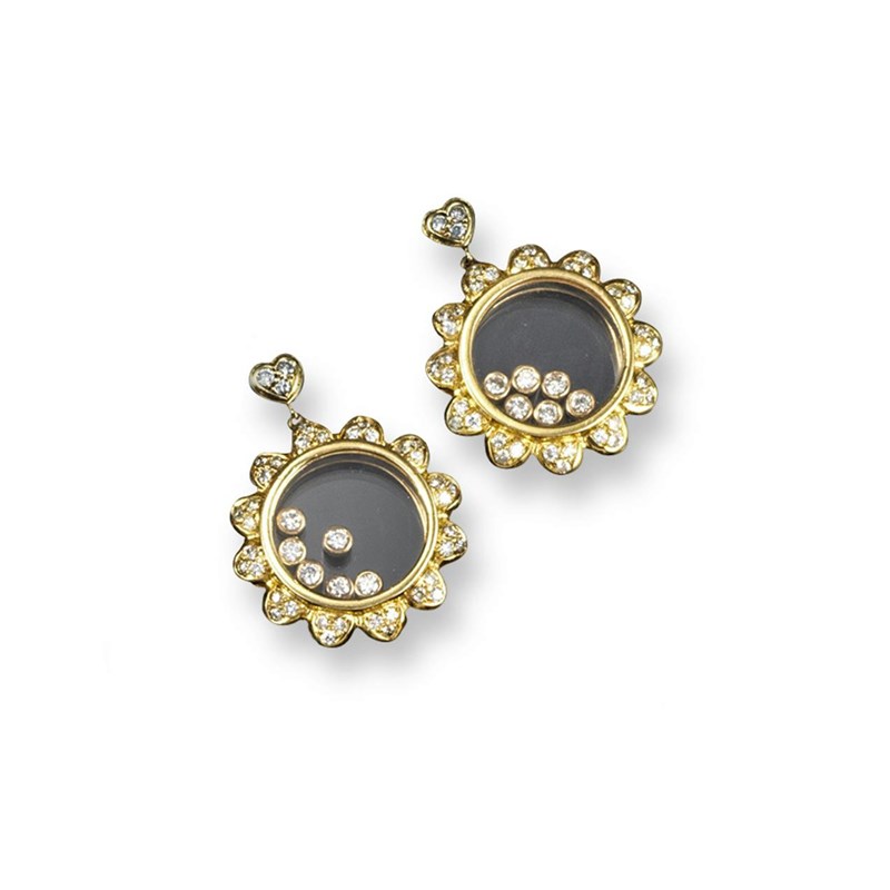 A pair of diamond set drop earrings, each with a glazed circular section containing six free moving round brilliant-cut diamonds in gold rubover closed-back mounts. Within a border of smaller circular-cut diamonds and suspending from a diamond-set heart-shaped upper section.