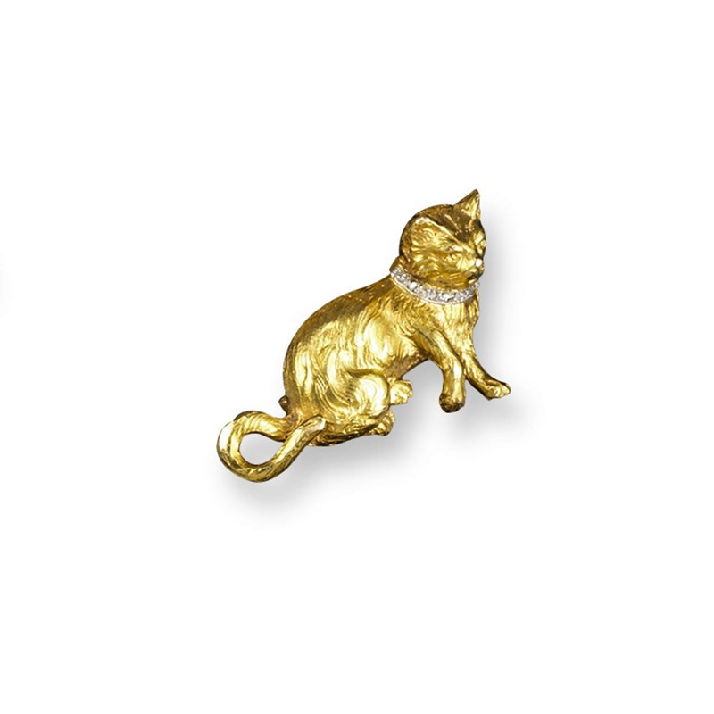 A gold cat brooch, the realistically formed cat is set with a diamond-set collar in yellow gold. 3.2cm wide.