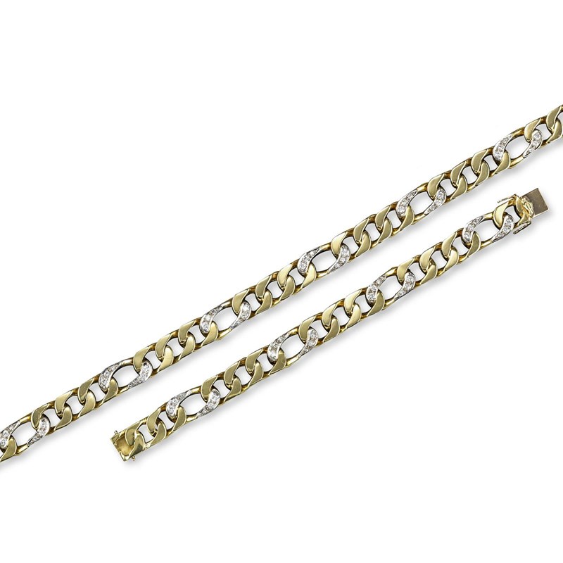A yellow gold flat link necklace, with diamond set links and matching bracelet. The necklace 38cm, the bracelet 18cm. 158g in total.