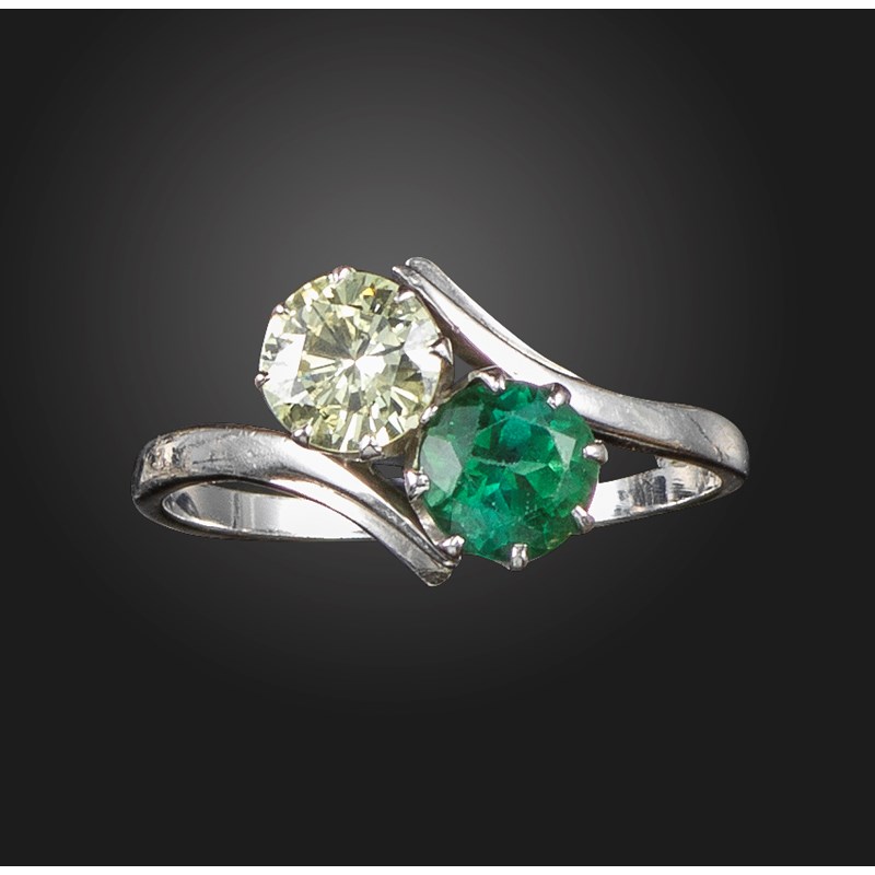A tourmaline and diamond crossover ring, set with a circular-cut green tourmaline and a round brilliant-cut diamond in white gold, size U