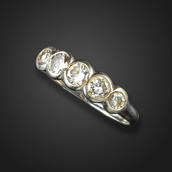 A diamond five stone ring, the graduated round brilliant-cut diamonds are rubover set in platinum, size M