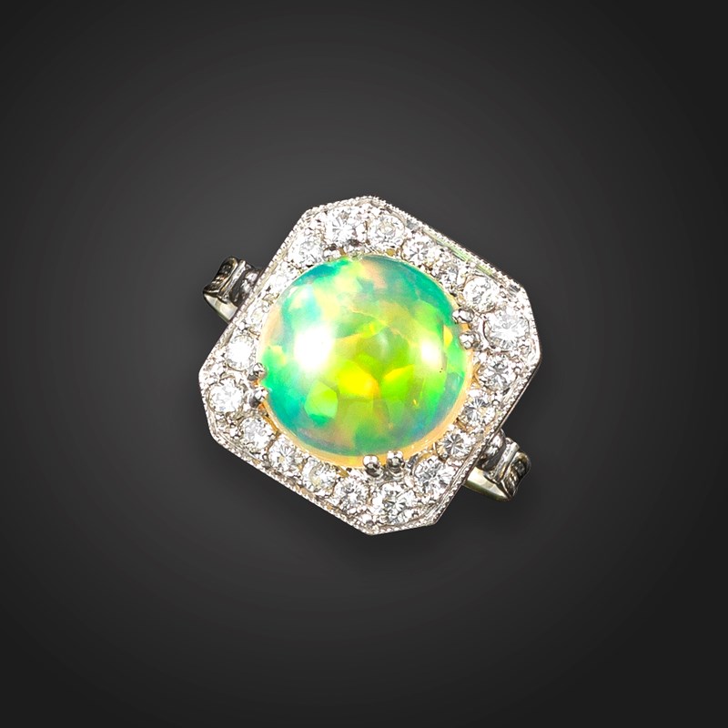 An opal and diamond cluster ring, the opal cabochon set within an octagonal surround of round brilliant-cut diamonds in white gold, size Q