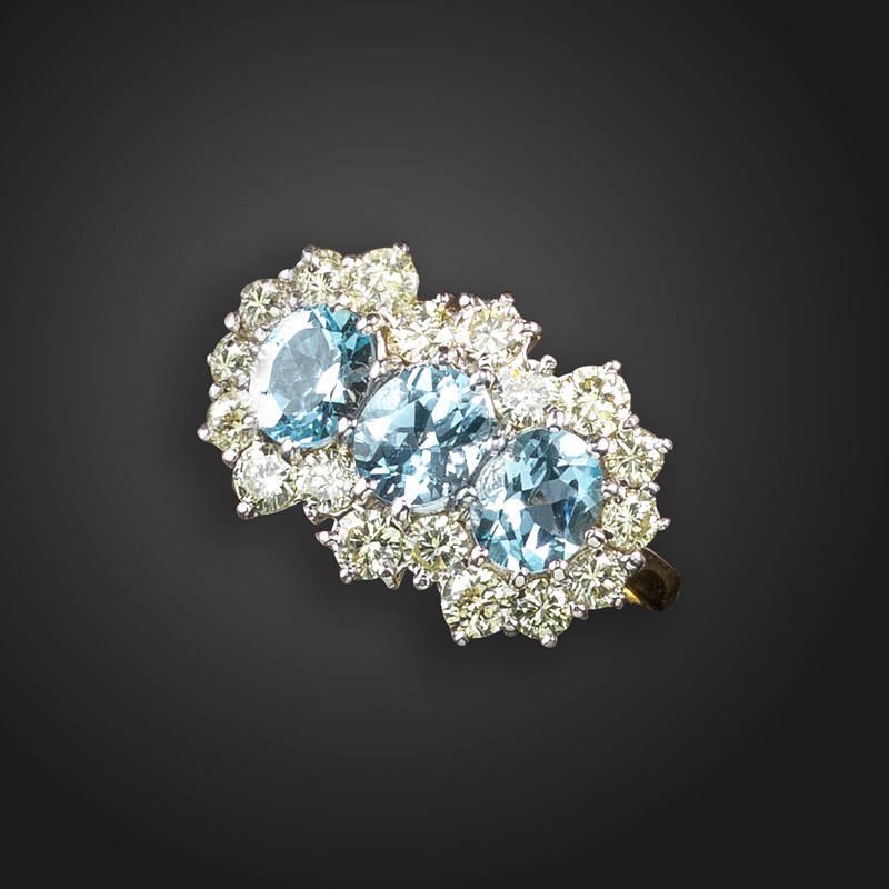 An aquamarine and diamond triple cluster ring, the oval-shaped aquamarines set within a surround of graduated round brilliant-cut diamonds in two-colour gold, 18ct London hallmarks for 1982, size P