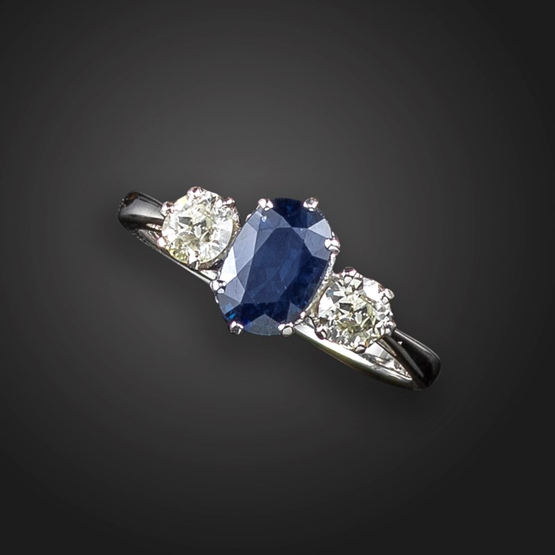 A sapphire and diamond three-stone ring
