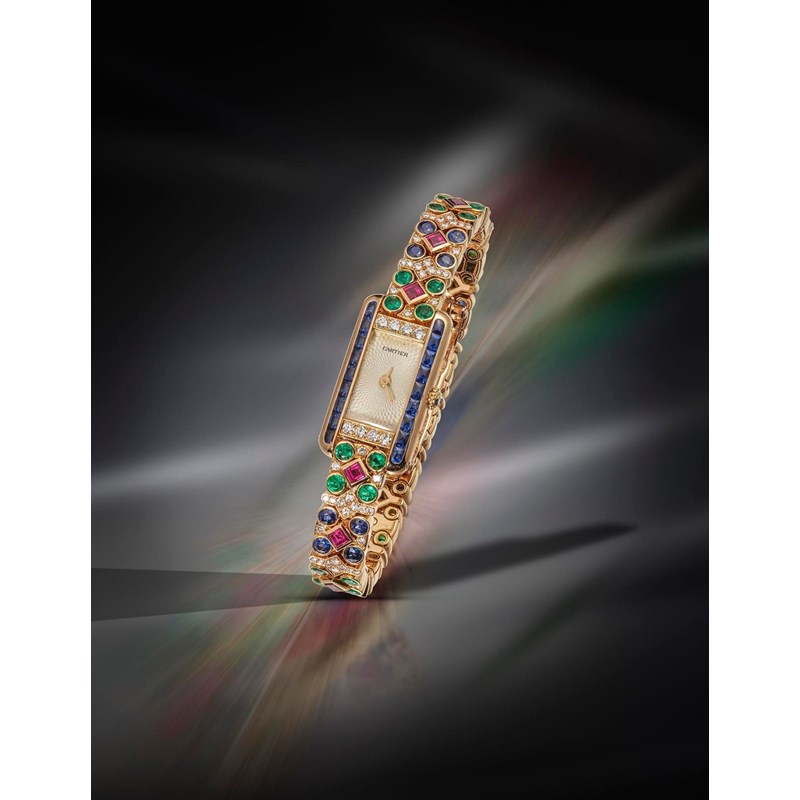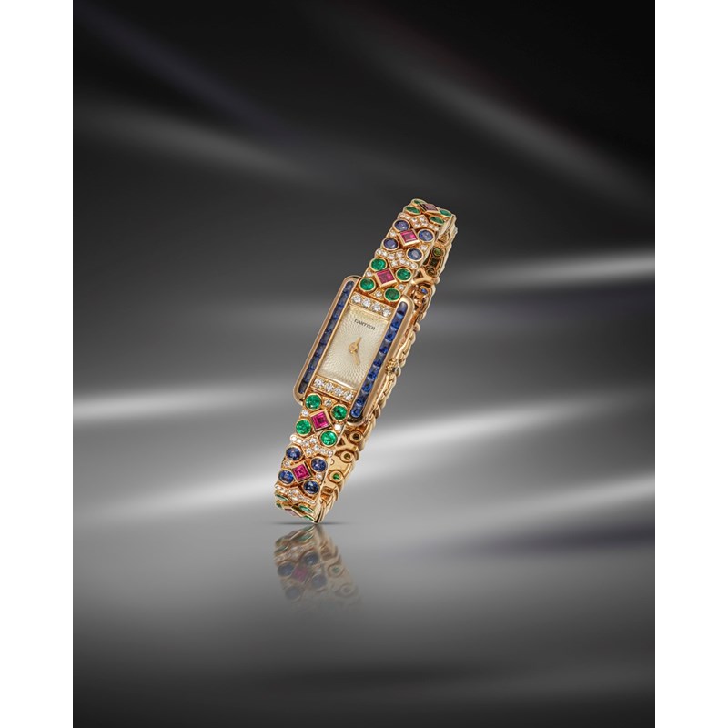 A lady's gem-set 'St Petersburg' Tank Allongée gold wristwatch, by Cartier, c.1970, the mini tank allongée wristwatch designed with a rectangular engine-turned dial within buff-top sapphire sides, the square-shaped ruby and circular-cut emerald and sapphire bracelet with diamond detail and deployant clasp, quartz movement, calibre 028, numbered 280. 002, case 15mm, signed Cartier Paris, French control marks, numbered 663595
