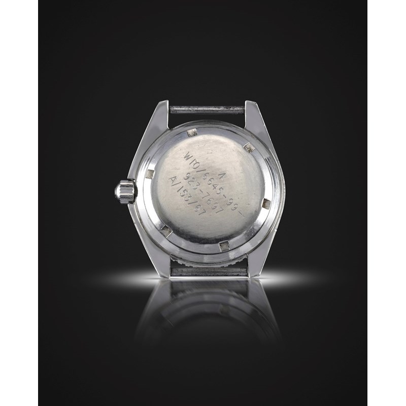 A number of distinct features set these military-issued watches apart from Omega's regular production units. Their cases have distinctive curved and beveled lugs and were delivered with fixed spring bars. The dials feature an encircled "T" signifying the use of tritium for the luminous hour markers and hands. Their case backs were engraved by the Ministry of Defense with the military branch code, issue number, and year of issue. The "W10" designation indicates that this Seamaster 300 was one of a small number issued to the British Army.