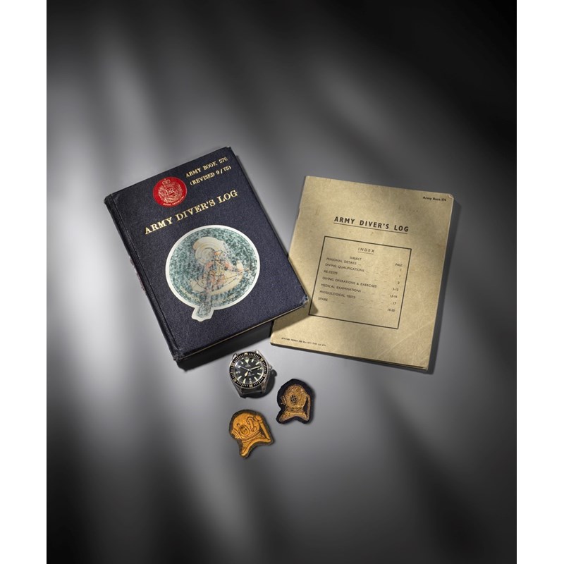 Accompanied by two army diving log books, the first from the initial qualification (1974-1979) the second enhanced log book issued in line with the new health & safety legislation (1979 - 2012), with two fabric MOD service-issued diving badges (supervisor grade).