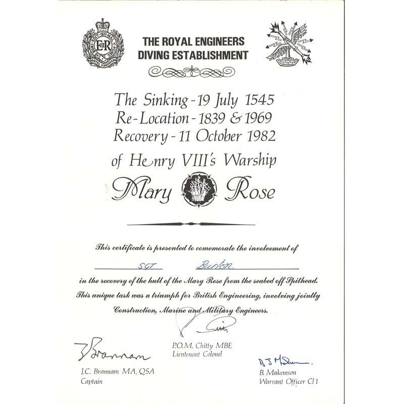 Provenance: owned and submitted for auction by Mr M. Burton who joined the Royal Engineers in May 1970 as a Sapper and left August 1995 as a Warrant Officer class 1 (WO1), Engineer Diver. Amongst his diving achievements were helping to raise the hull of King Henry VIII's favourite ship, The Mary Rose in 1982, which sank in the Solent in 1545. Regimental Sergeant Major Burton also served in Belize, Hong Kong, Norway, Northern Ireland, Oman, Cyprus, Germany and Kenya where his extraordinary diving skills were deployed throughout.