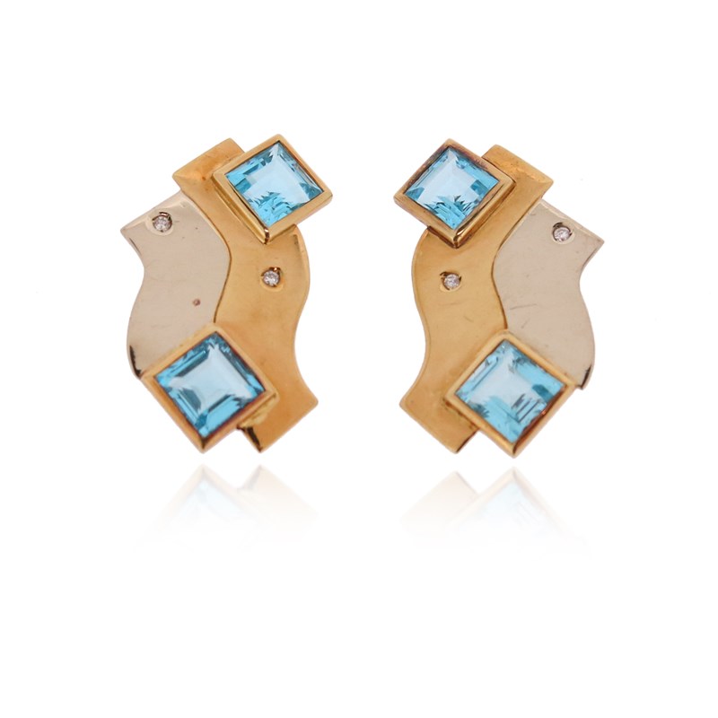A pair of abstract topaz and diamond earrings by Manfredi, set with two square-shaped blue topaz and two diamonds on two-colour gold, clip fittings, 3.8cm longest
