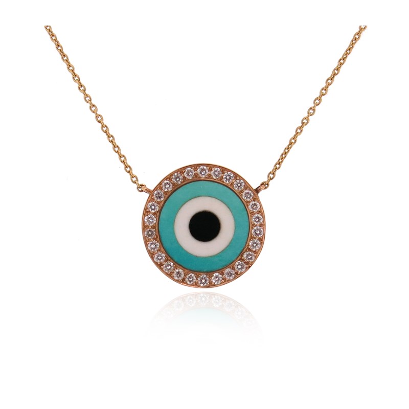 A diamond and hardstone-set 'Evil Eye' pendant, the circular pendant with concentric hardstone inlay within a surround of round brilliant-cut diamonds in gold, on a fine-link gold neck chain, pendant 1.8cm high, chain 22cm long