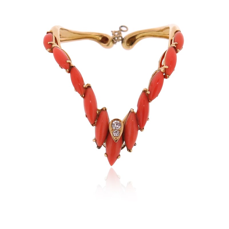 ‡ A coral and diamond-set bangle by David Morris, of chevron design, set with navette-shaped coral cabochons and two round brilliant-cut diamonds in gold, 18ct London import for 1972, adjustable, 3.5cm wide