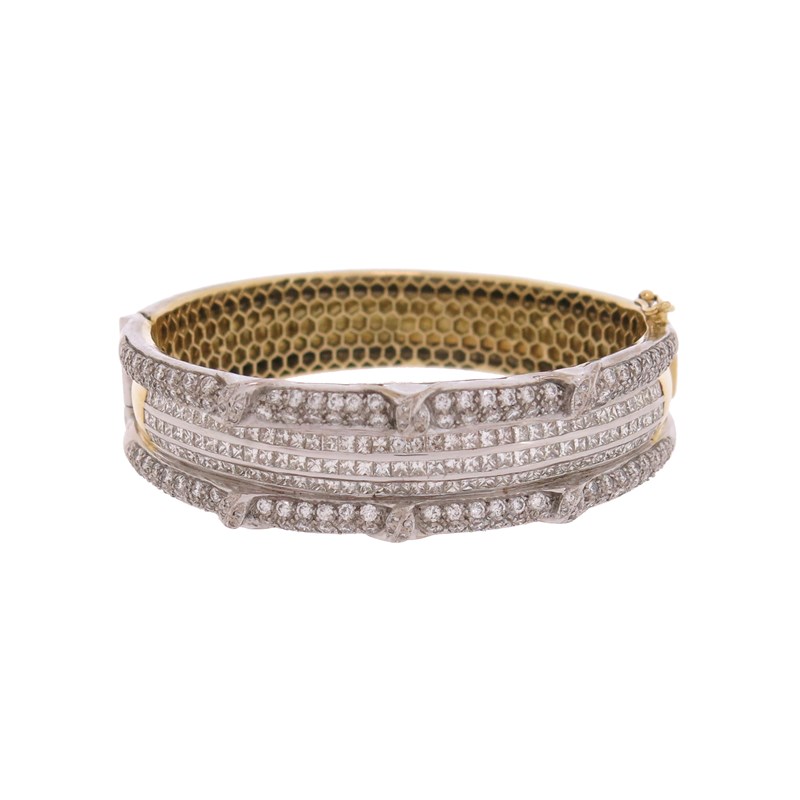 A diamond-set gold bangle, set with princess-cut and round brilliant-cut diamonds in platinum and yellow gold, 5.8cm inner diameter, 73g