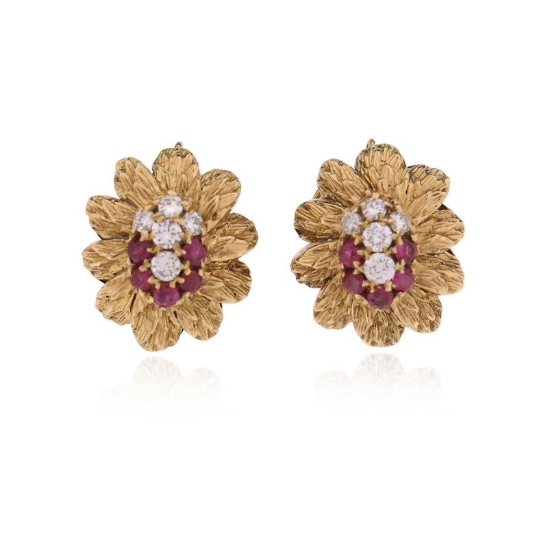 A pair of ruby and diamond clip earrings, of flowerhead design, centred with a cluster of circular-cut rubies and diamonds in textured yellow gold, stamped Italy, French import marks, clip fittings and pendant loops, 2.5cm high