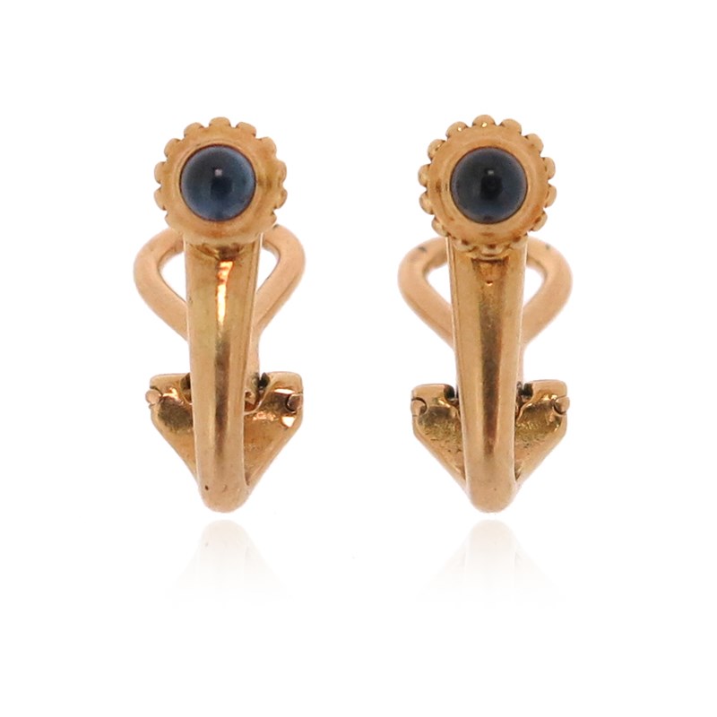 A pair of sapphire and diamond clip earrings by Cartier, set with cabochon sapphires with gold pellet borders, signed Cartier, inventory number 164367, French import marks, maker's mark SCA, 1.5cm high
