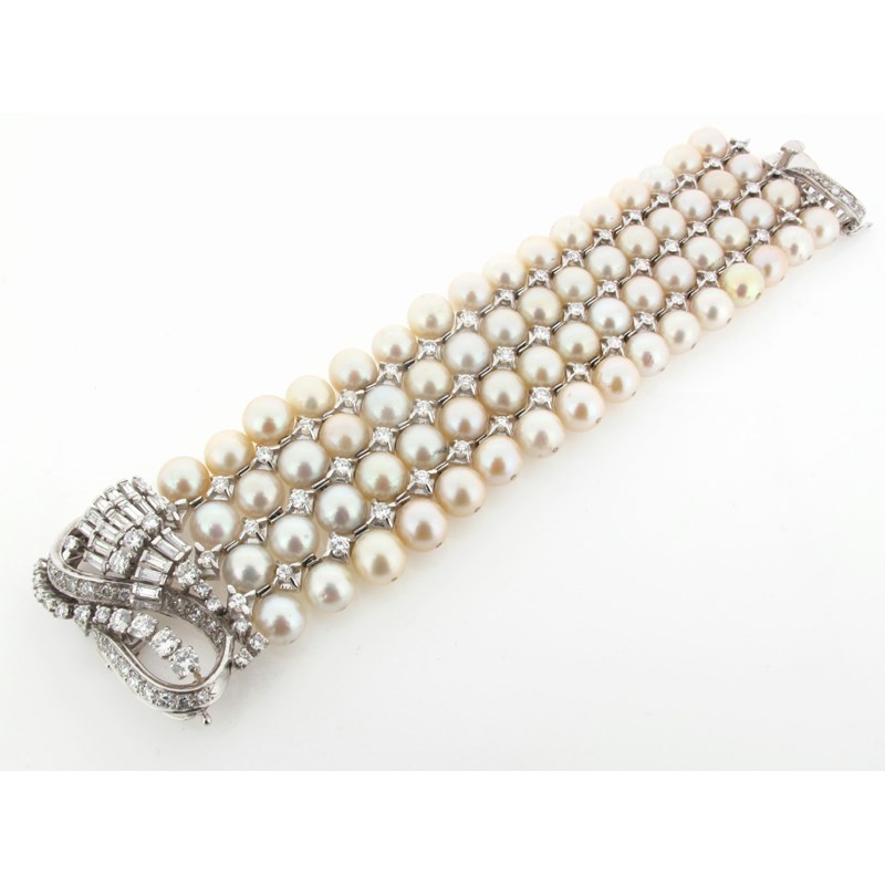 A substantial cultured pearl and diamond bracelet, formed with four rows of pearls and separated with lines of round brilliant cut diamonds in white gold. The clasp set with graduated round brilliant cut and baguette shaped diamonds. 18cm wide.