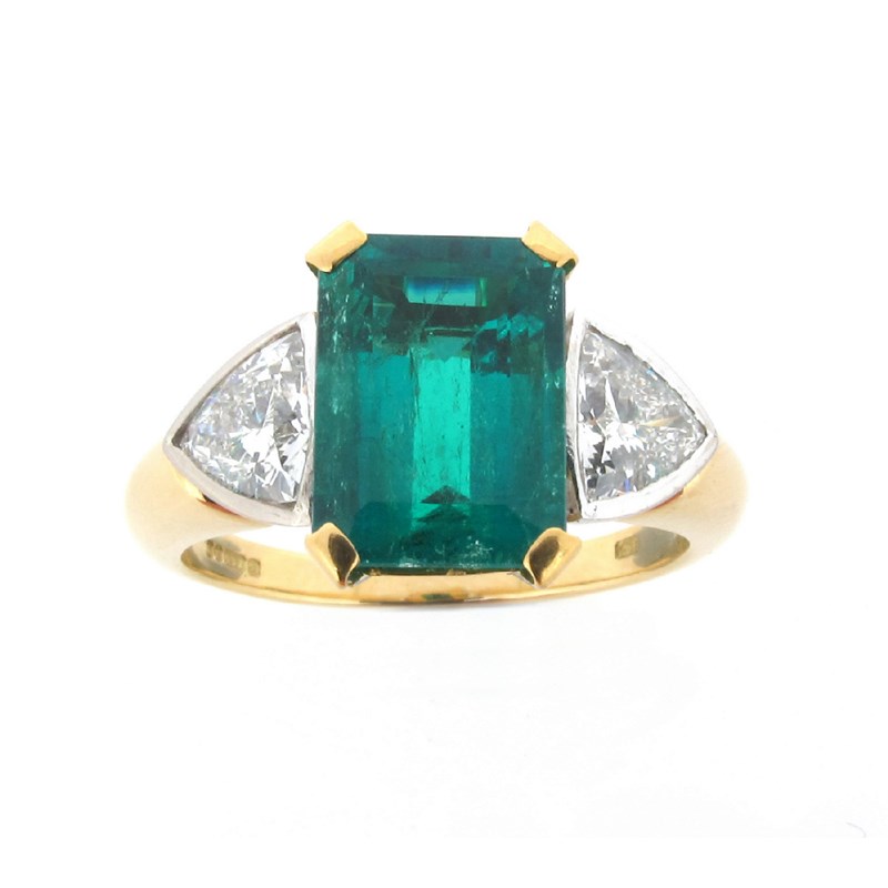 An emerald and diamond three stone ring, the emerald is set with two trigon shaped shoulder diamonds in 18ct yellow and white gold. Size S.