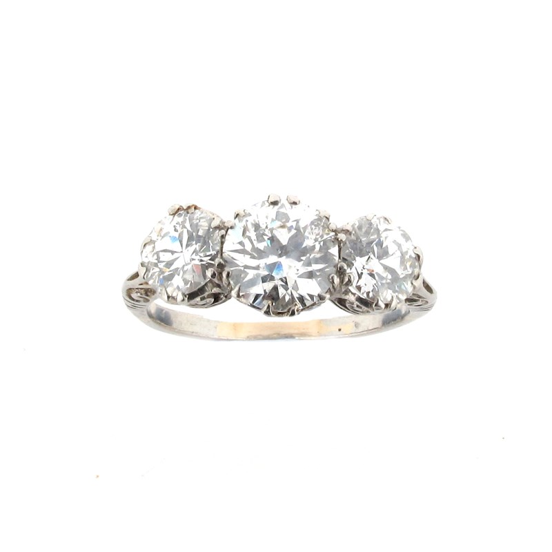 A diamond three stone ring, the centre old circular brilliant cut diamond weighs approximately 1.50cts and the three diamonds weigh approximately 2.80cts in total. Set in platinum with coronet colets and engraved shoulders. Size Q 1/2.