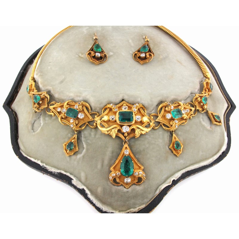 A Victorian emerald and diamond necklace, with matching earrings. The necklace mounted with seven rectangular and pear shaped emeralds within diamond set scrolls, suspending five emerald set gold pendants, the centre pendant set with further diamonds. And similar emerald and diamond set gold earrings. Fitted case.