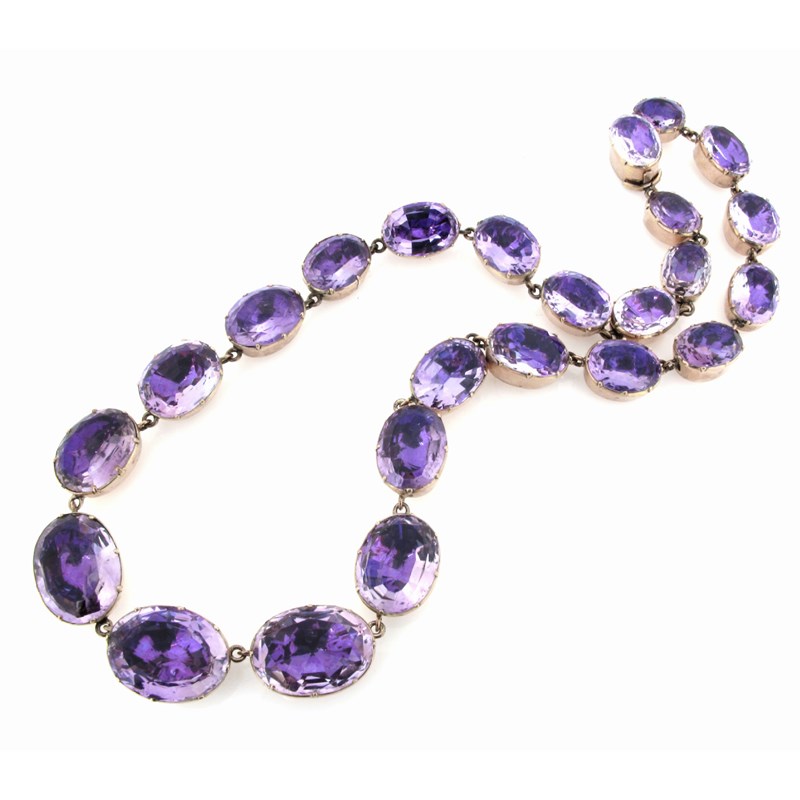 A Victorian amethyst rivière necklace, the graduated oval shaped foil backed amethysts are each mounted in closed back gold collets. 39cm long.