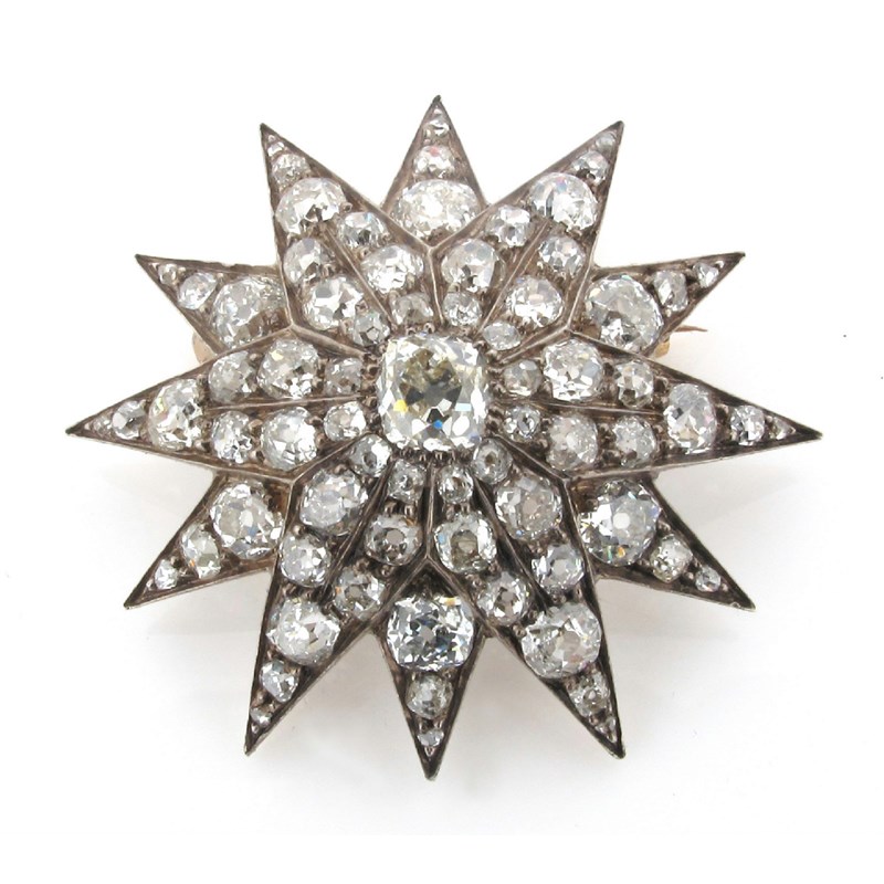 A late Victorian diamond set star brooch, centred with a cushion shaped diamond and further graduated smaller diamonds set to the twelve rays. In silver and gold. Detachable brooch fitting. Fitted case.