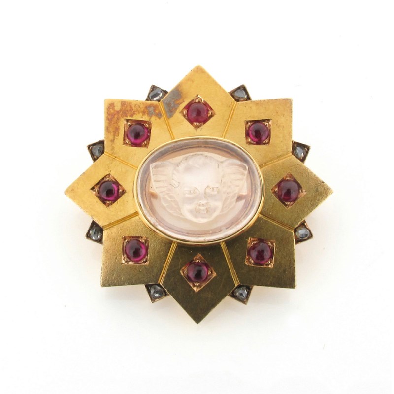 A Russian moonstone, ruby and diamond set gold star-form brooch, centred with an oval shaped moonstone carved with the winged head of a cherub. The rays set with cabochon rubies and separated with rose cut diamonds. With initials S.C and LO in cyrillic. 56 Zolotnik mark and a Moscow mark. Cased. 2.8cm wide.