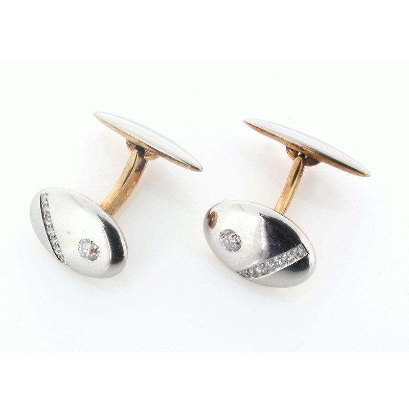 A pair of diamond set gold and platinum oval cuff links, marked KW. Fitted case by E.Meister, Zurich.